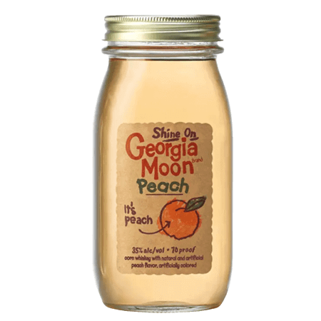 Shine On Georgia Moon Peach is, as you might expect, made from everyone's favorite 30-day-old American corn whiskey with a bit of natural peach flavoring in it. Splendid. Georgia Moon Corn Whiskey is uniquely packaged in a mason jar with 35% ABV.